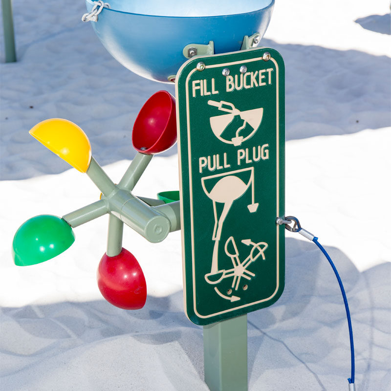 Our Sand Wheel is an inclusive play product which is best used in a sand pit or with sand softfall. The sand wheel has a bowl attached which scoops up sand to put into the bowl and sifted through to a rotating sand wheel with various attached bowls.